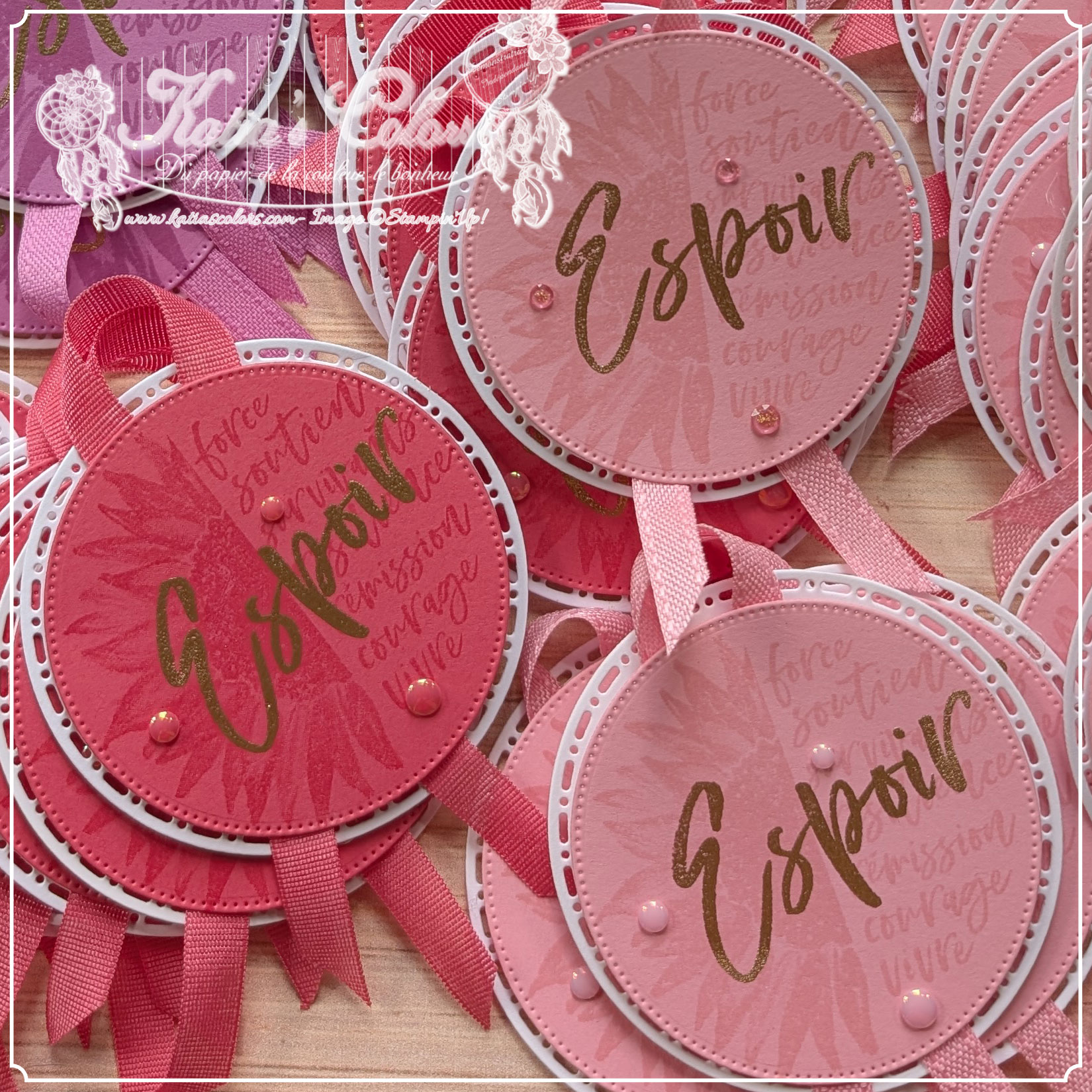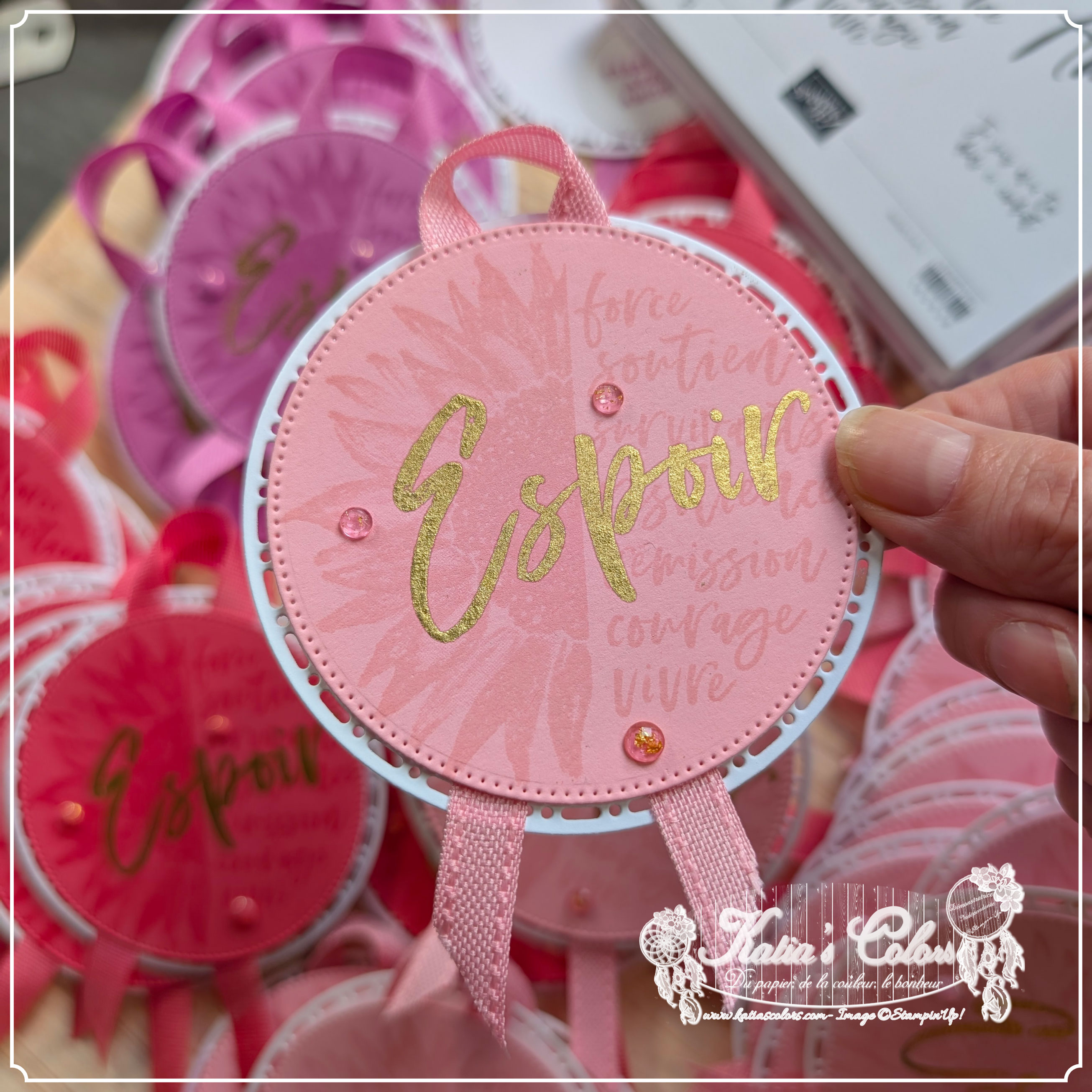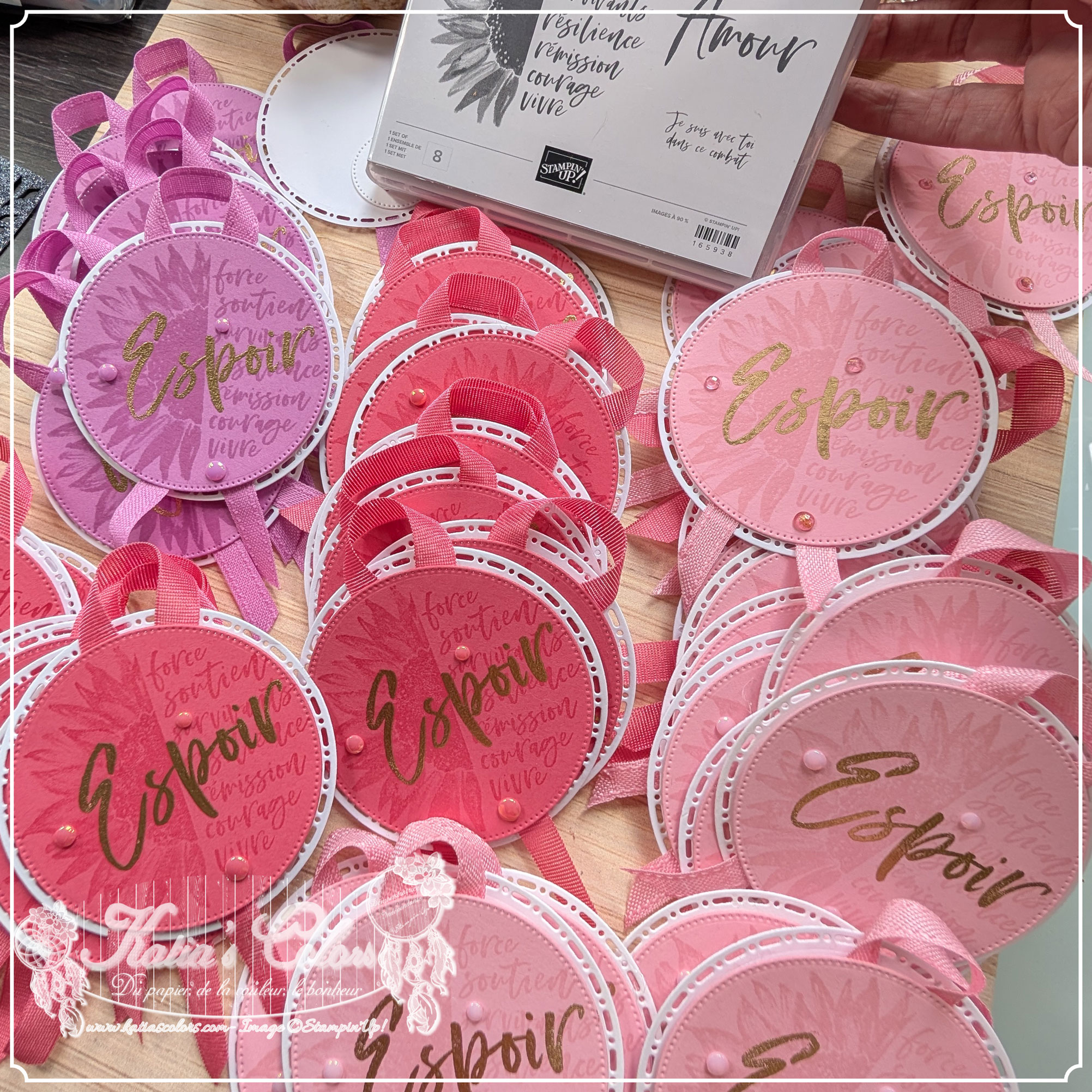 Chaque tag est agrémenté d’un ruban coordonné et décoré avec des mots qui portent un message puissant : Espoir sur un fond avec des mots tel que Force, Soutien, Résilience, Courage, Vivre. De petites attentions qui transmettent beaucoup d’amour et de solidarité.